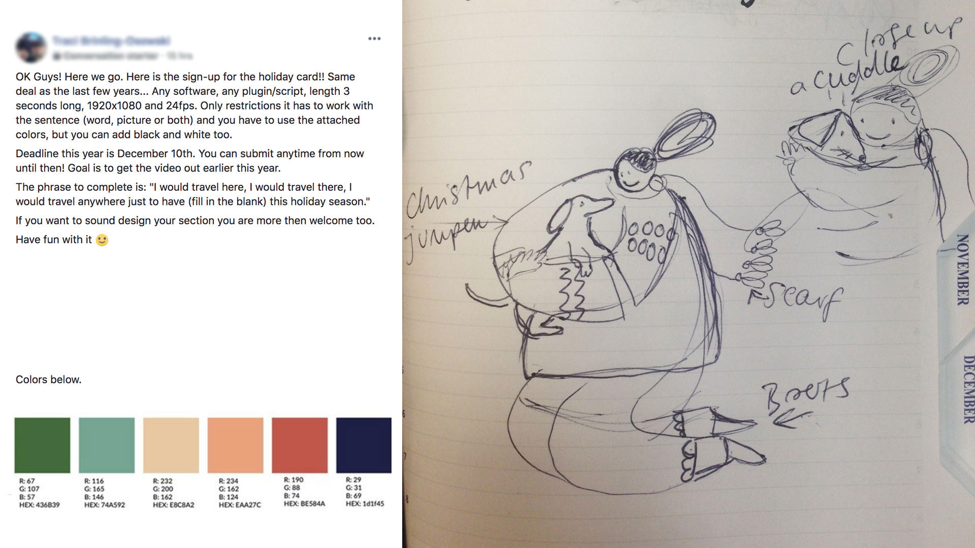 I took part in a digital Christmas card featuring 100 animators. My illustration and animation is at 00:20 and I also did the illustration with animation by Priyank Hegde at 05:13.